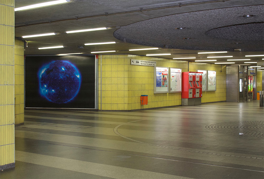 Das spektakuläre Motiv einer blauen Sonne im Zentrum von „DIE SONNE UM MITTERNACHT SCHAUEN SDO/NASA (Blue)“ (2010-2015) lässt sich auf eine Digitalanimation zurückführen, die Sieverding aus rund 200.000 auf NASA-Daten basierenden Einzelbildern entwickelt hat. Die Animation wurde zur Grundlage für zwei Filme, die als komprimierte Zeitbilder die Möglichkeit suggerieren, die Sonne durch das Erdinnere hindurch zu beobachten. Bei der präsentierten Fassung handelt es sich um ein Standbild aus der Animation.